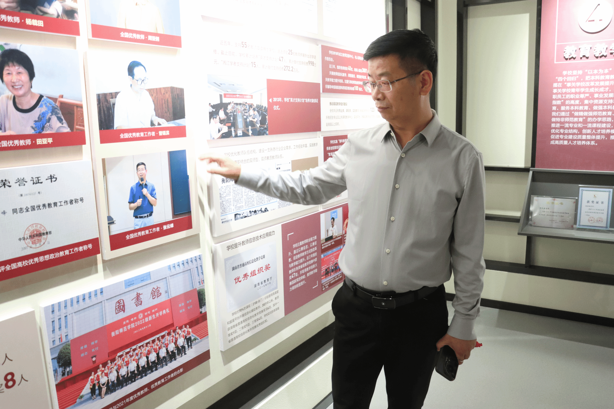 大家在讲解员的引导下步入校史馆,从“南路师范学堂”到“第三师范”,再到“衡阳师范学院”,经过这三道大门,通过“飞雪迎春,花开黄茶”、“血脉赓续,继往开来”、“春风化雨,桃李芬芳”、“乘风破浪,扬帆远航”几大板块的展览,我校的百廿风貌跃然眼前,党员们回顾了我校的发展历程、文化传统、师资力量和优秀校友,并对此有了进一步的认识。在参观过程中党总支张云峰书记也向大家分享了展板上照片背后的故事。