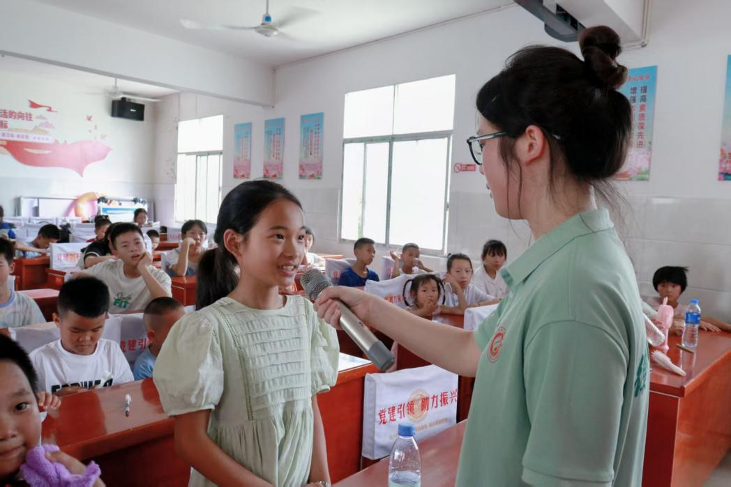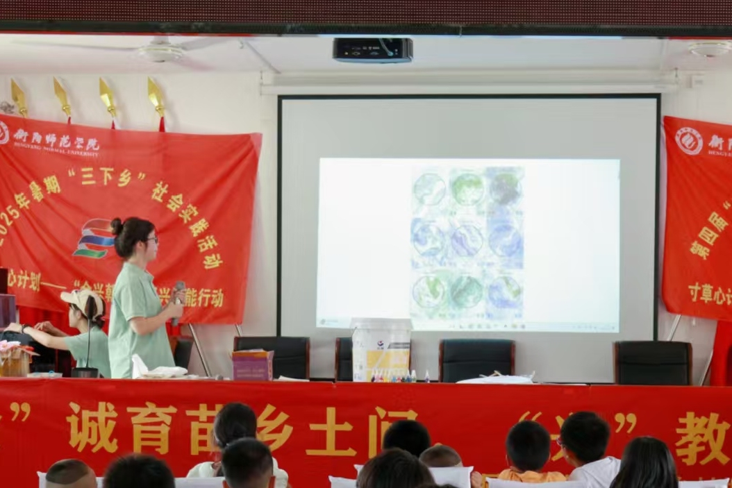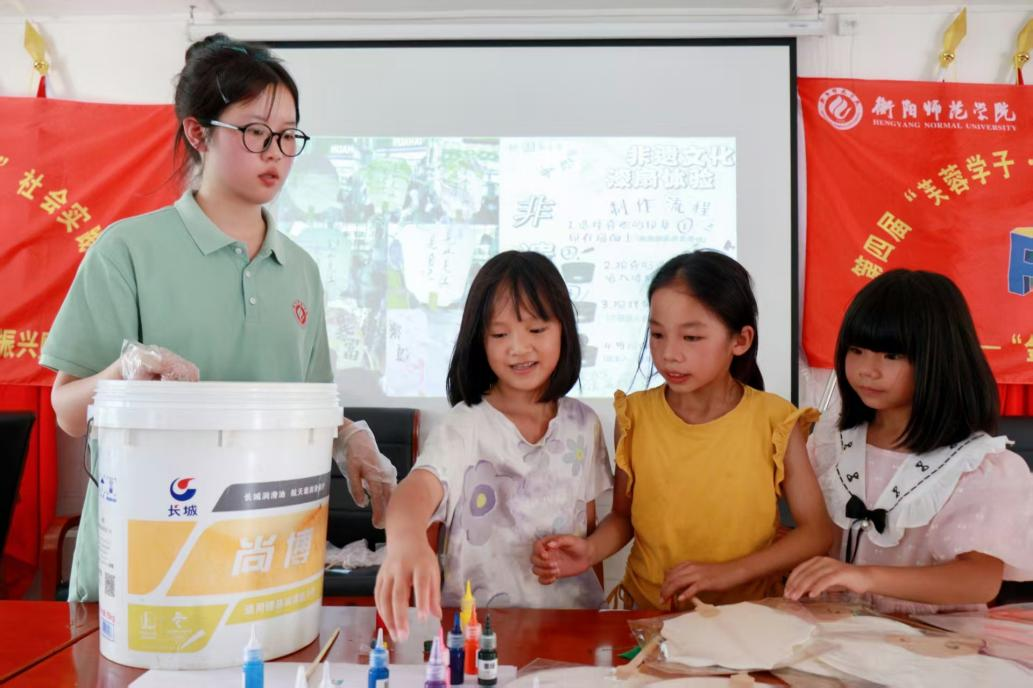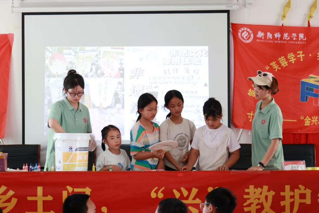 7月9日,邵阳市城步苗族自治县茅坪镇金兴村内,衡阳师范学院文学院芙蓉学子寸草心计划——“金兴育禾,青苗向阳”乡村振兴实践服务团在此开设“争做非遗传承人”漆扇体验课,本堂课由实践团成员王慧执教,她将美育理念深入乡村课堂,带领孩子们感悟传统文化的独特韵味,在传承非遗文化的同时,激发孩子们对美的感知与创造力,以促进其德智体美劳全面发展。