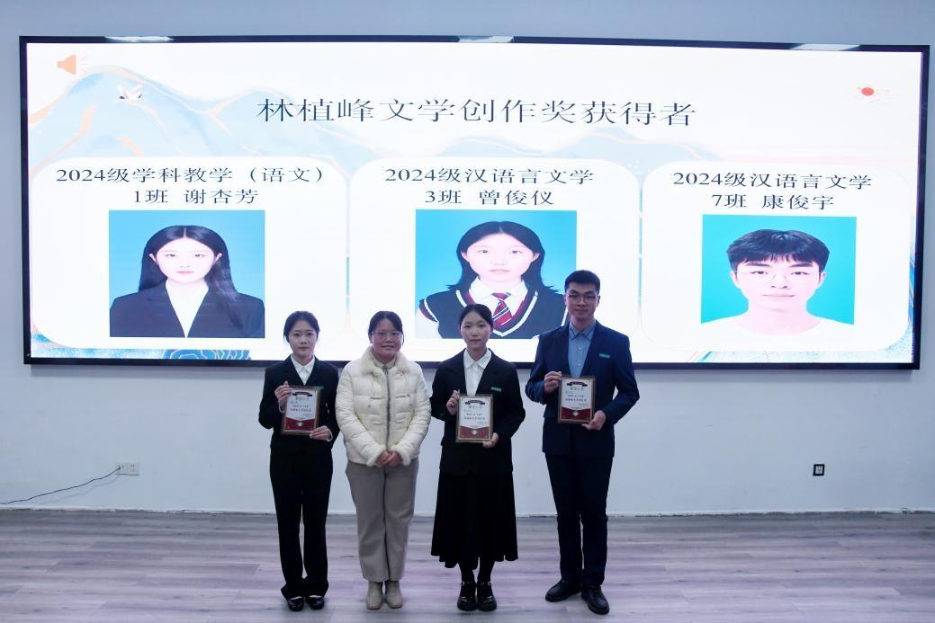 在之后进行的颁奖环节中,学院为各领域表现突出的学子分别颁发了创新创业奖、公益奉献奖、林植峰文学创作奖、文体风采奖、师范卓越奖、优秀团队奖及各项提名奖。每一项荣誉的授予,既是对同学们在创新创业、公益服务、文学创作、文体活动、师范技能及团队建设等方面突出表现的嘉奖与肯定,也是对全体文学院学子坚守文学热爱、勇毅前行的激励。