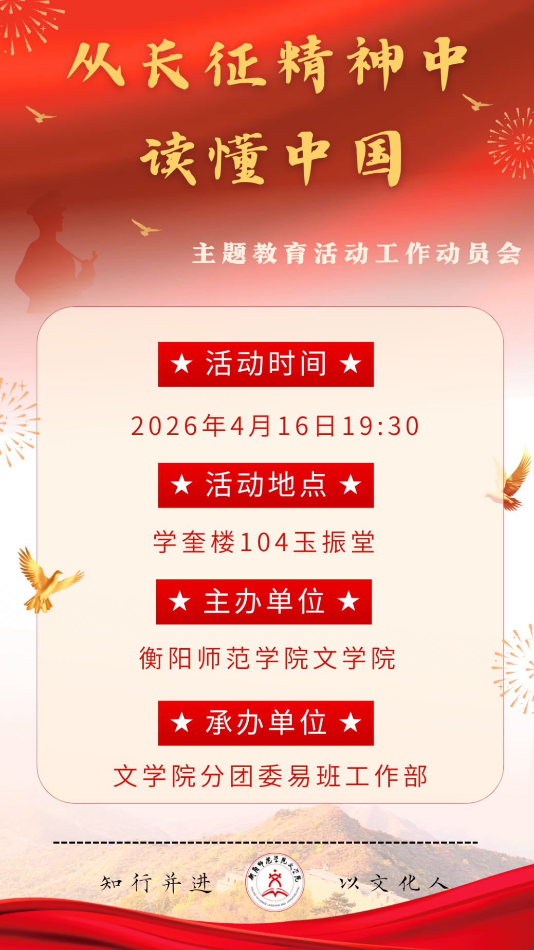 当雪山草地的足迹穿越百年,当信仰的火炬照亮前路,那段波澜壮阔的长征征程,早已成为刻在民族骨血里的精神丰碑。新时代青年,在红色精神中汲取力量,坚定前行,衡阳师范学院文学院“从长征精神中读懂中国”主题教育活动即将举办,诚邀全体同学共同参与,一起感悟初心、收获成长。