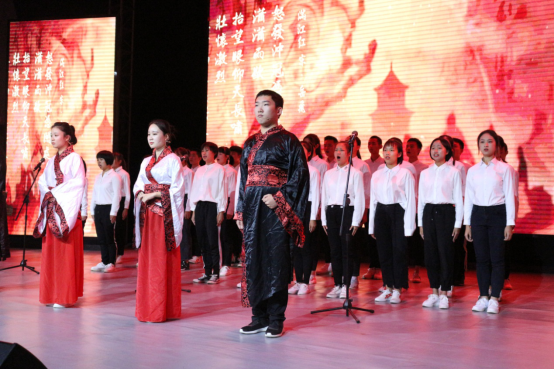 “您是泰山的顶峰,崇高又坚硬;您是冲过三峡的长江,汹涌奔腾,一想到您六十一年的形象,耳边呼啸起骤雨狂风!”中兴通讯信息工程学院为观众们带来了臧克家的诗歌《您是》,重章叠唱的诗句中,隐藏着暗潮汹涌的澎湃,蕴含着鼓舞人心的力量。