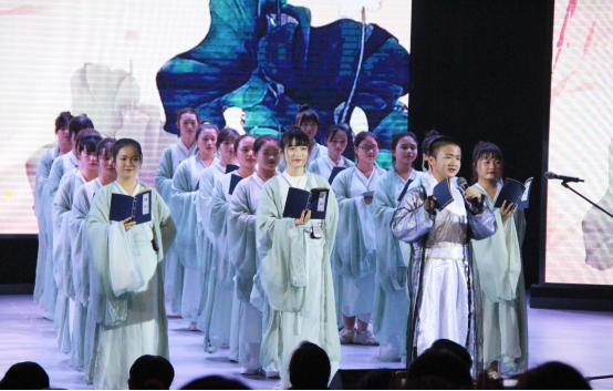 画与诗的结合则勾勒出了浓厚的书香气息,在如此氛围之下,文学院带来了《礼记》。“大学之道,在明明德,在亲民,在止于至善。”夫子的谆谆教诲铿锵有力、掷地有声,文院学子带着大家一起聆听先贤的教导,展现着独属于文学院的古典韵味。