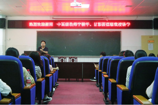 5月24日下午,衡南一中高级教师宁朝华、甘彩霞莅临我校讲学,本次活动开展地点为文D603,文学院副院长杨旭明担任主持人,2016级汉语言文学专业学生代表聆听了讲座。